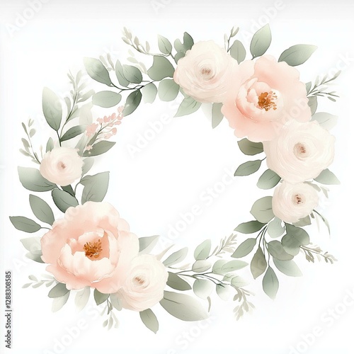 © vilaiporn, Naklejka premium Elegant floral wreath featuring soft pink flowers and lush greenery, perfect for wedding invitations or decor.
