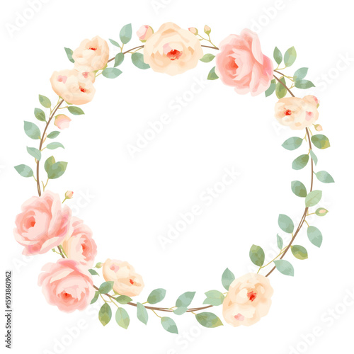 © Nisrina, Fototapeta premium Elegant Floral Wreath Illustration with Pastel Roses and Lush Greenery for Invitations and Creative Projects