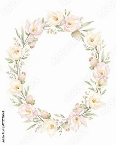 Fototapeta premium Elegant floral wreath with soft pastel flowers on empty background with copy...