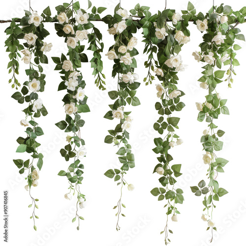 © peacehunter, Naklejka premium Elegant Flower Hanging with White Roses and Green Leaves for Home Decor and Event Decoration