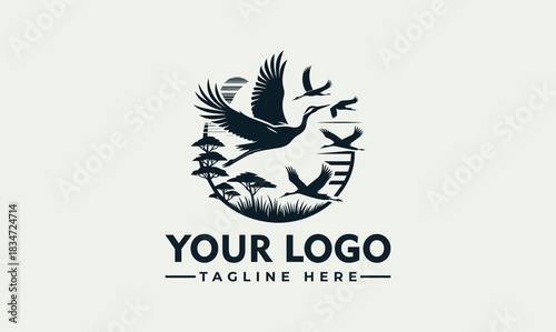 © nuaari, Obraz premium Elegant flying crane flock over a natural landscape vector. logo. illustration