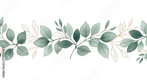 © SabsePahale, Naklejka premium Elegant Foliage Border Design: A sophisticated illustration featuring a delicate border of green and gold leaves, meticulously arranged to create a visually appealing seamless pattern.