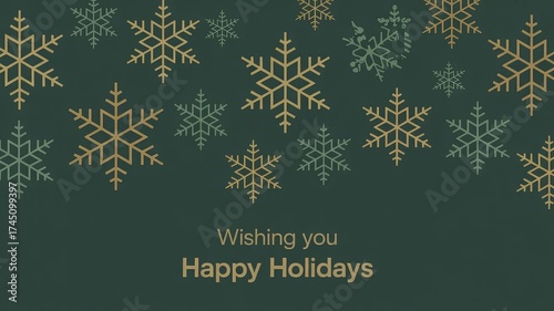 Fototapeta premium Elegant forest green holiday card with gold and turquoise snowflakes in a clean festive layout.