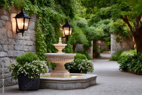 © kardaska, Fototapeta premium Elegant fountain illuminating a peaceful garden path