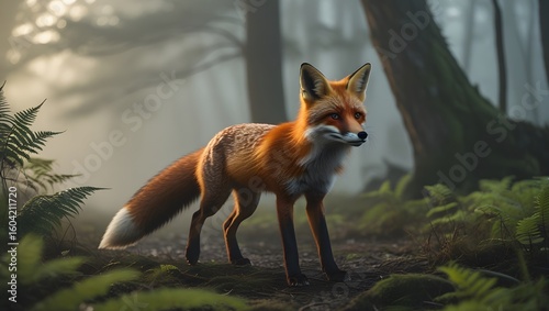 Fototapeta premium Elegant Fox with White-Tipped Tail in Mystical Woodland Setting