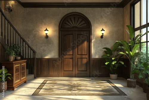 Fototapeta premium Elegant Foyer with Arched Wooden Door and Sunlit Floor