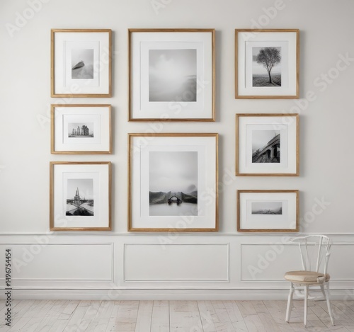 Fototapeta premium Elegant gallery wall mockup; diverse frames, white background, different sizes, photography