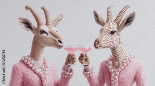 Fototapeta premium Elegant gazelle and zebra-like animals in tweed and pearls clinking pink...