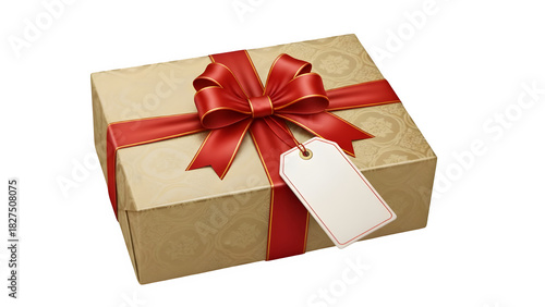 © MdAbdus, Obraz premium Elegant gift box with red ribbon and blank tag on black background