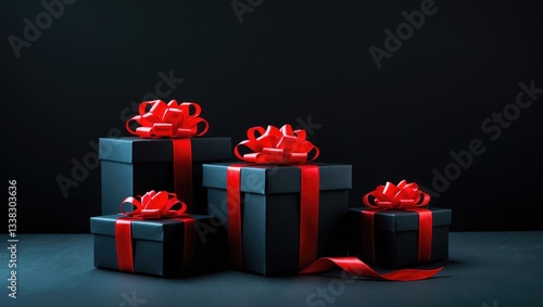 © Giovanni, Obraz premium Elegant gift boxes adorned with bows against a black background.
