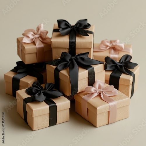 © Siti, Obraz premium Elegant Gift Boxes with Bows: Neutral Colors and Stylish Ribbons