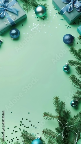 Fototapeta premium Elegant gifts with blue baubles and pine branches