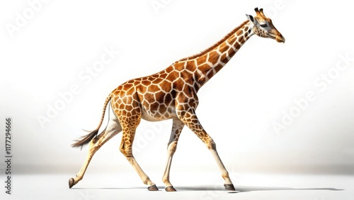 Fototapeta premium Elegant giraffe strides, isolated against a clean background; perfect safari...