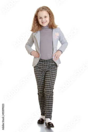 Fototapeta premium Elegant girl schoolgirl in a pantsuit