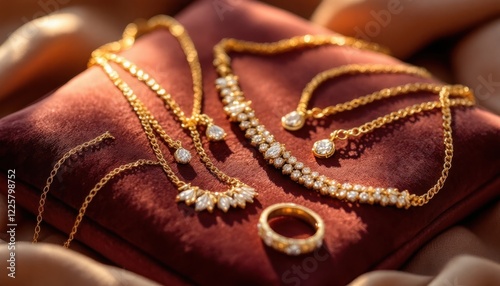 Obraz premium Elegant gold and diamond jewelry set on velvet display