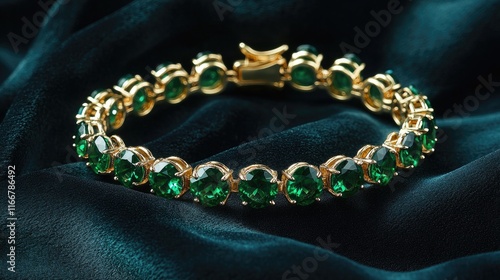 Fototapeta premium Elegant Gold Bracelet with Green Gemstones on Soft Black Fabric