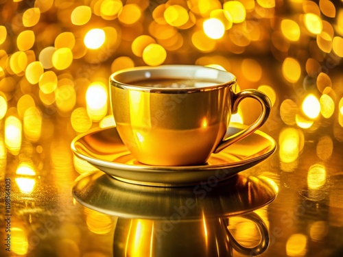 © Supittra, Obraz premium Elegant Gold Coffee Cup Mockup with Bokeh Background - Premium Stock Photo