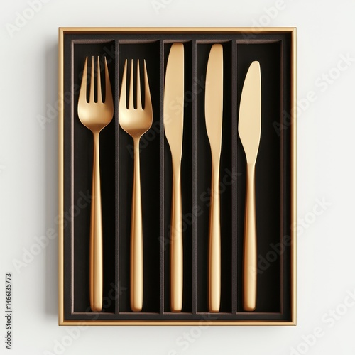 © june, Fototapeta premium Elegant Gold Cutlery Set Displayed in Black Velvet Tray