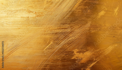 Fototapeta premium Elegant gold foil texture with distressed finish for luxury design. Abstract grunge metallic surface with scratches and smudges. Versatile golden backdrop for creative projects in fashion