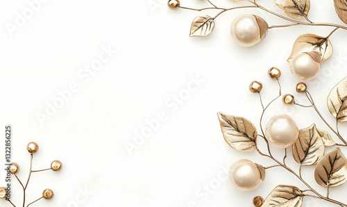 © Chantanapa, Fototapeta premium Elegant Gold Leaf and Pearl Arrangement on Soft Neutral Background