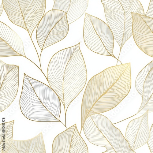 Fototapeta premium Elegant gold-line leaf-pattern wallpaper on white, seamless and simple...