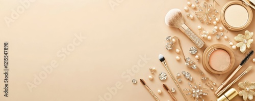 Fototapeta premium Elegant gold makeup and jewelry arrangement on beige background