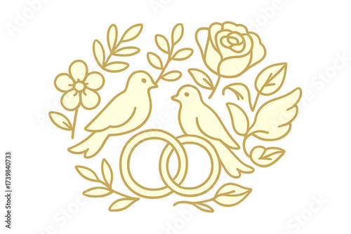 Fototapeta premium Elegant gold motif with lovebirds, intertwined wedding rings, and delicate floral elements