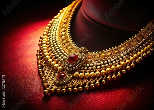 © Manatsavee, Obraz premium Elegant Gold Necklace on Red and Black Background - Luxury Jewelry Stock Photo
