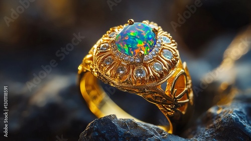 Naklejka premium Elegant Gold Opal Ring with Diamond Accents Exquisite Jewelry Photography...