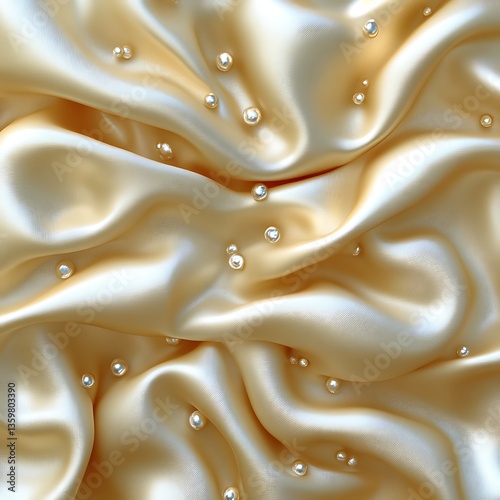 Obraz premium Elegant gold silk fabric, pearls scattered, studio shot, background blur,...