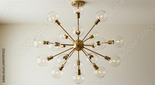 © SARA, Obraz premium Elegant Gold Sputnik Chandelier With Clear Glass Bulbs Modern Style Lighting
