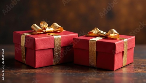 © StepRunnerIO, Obraz premium Elegant gold-threaded gift boxes on rich wood, wedding, detail