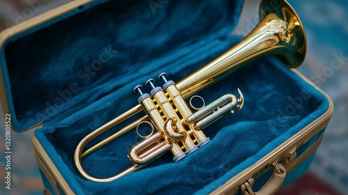 © aun, Obraz premium Elegant Gold Trumpet in Soft Blue Velvet Lined Case