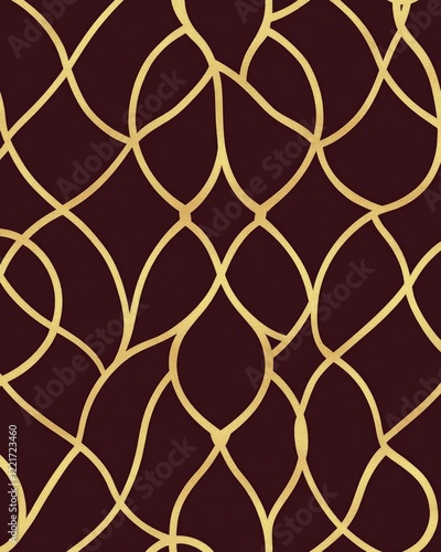 © Feri, Fototapeta premium Elegant Golden Abstract Pattern on Maroon Background: A Luxurious Seamless Design for Textiles and Decor