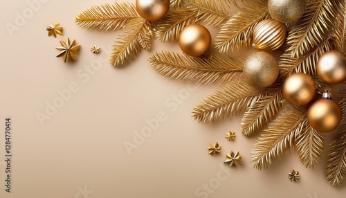 Naklejka premium Elegant golden Christmas tree branches adorned with decorative baubles on a soft beige background for festive celebrations