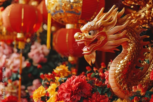 Fototapeta premium Elegant Golden Dragon with Lanterns and Flowers