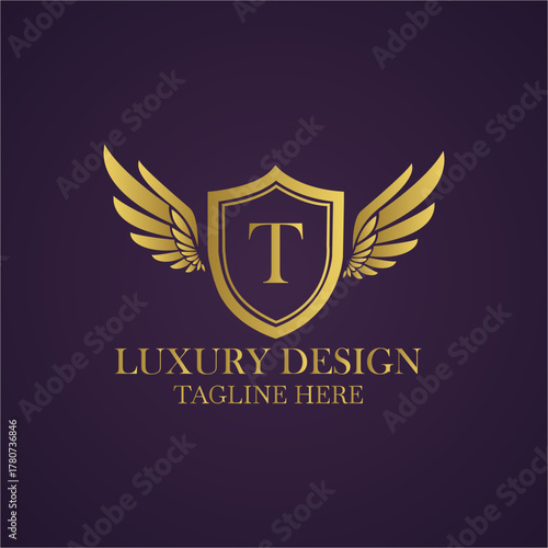 Obraz premium Elegant golden logo design with letter t, wings and shield on a dark purple background luxury design