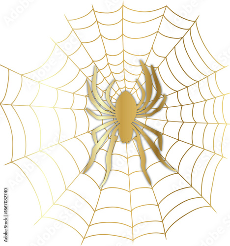 Fototapeta premium Elegant golden spider on a web with shiny metallic effect, perfect for Halloween designs, invitations, posters, backgrounds, and spooky decorative elements.