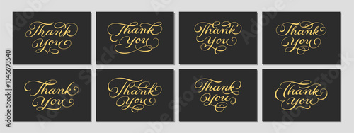 Obraz premium Elegant golden thank you calligraphy set with modern script flourishes. Thank you card design templates collection. Perfect for cards, invitations, greetings, weddings, or business appreciation.
