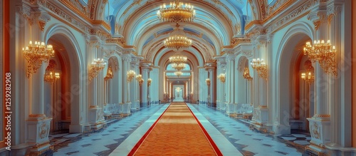 Fototapeta premium Elegant grand hallway with ornate chandeliers and a plush carpet, showcasing...