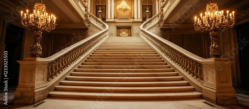 © MINHO, Obraz premium Elegant grand staircase adorned with chandeliers in a historic building's foyer