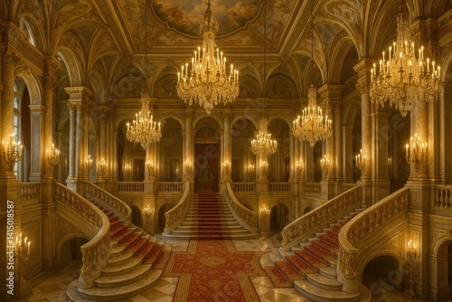 © Kitta Studio, Obraz premium Elegant Grand Staircase with Crystal Chandeliers in Historic Venue