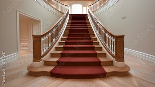 © StockPick, Obraz premium Elegant Grand Staircase with Plush Red Carpet and Crystal Accents - Luxurious Interior Design Featuring Dramatic Lighting and Warm Ambiance