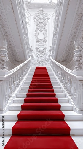Obraz premium Elegant grand staircase with red carpet in ornate white interior, luxury and...