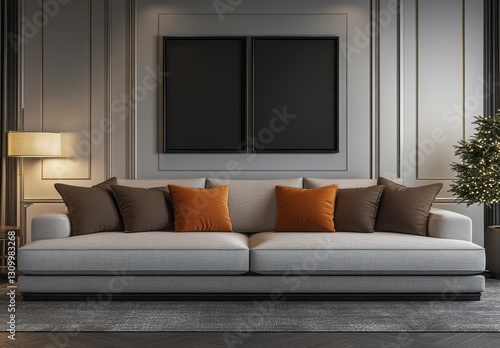 © Surin, Fototapeta premium Elegant Gray Living Room with Blue Patterned Sofa and Modern Decor