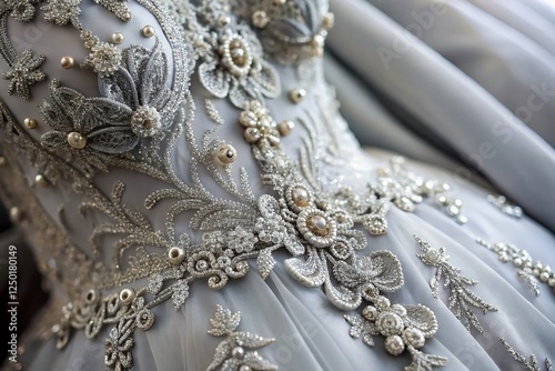 © Four888, Obraz premium Elegant Gray Wedding Dress Sleeve Detail: Handmade Lace & Rhinestone Embroidery