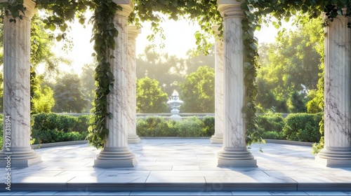 Fototapeta premium Elegant Greek-style arch pillars adorned with lush ivy vines. These marble...