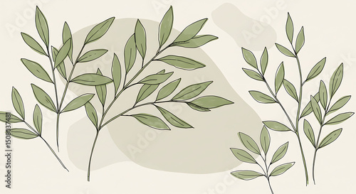 Fototapeta premium Elegant Green Botanical Illustration Line Art Leaves Branches Design