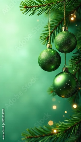 Fototapeta premium Elegant green Christmas wallpaper with shimmering ornaments and pine boughs ,...
