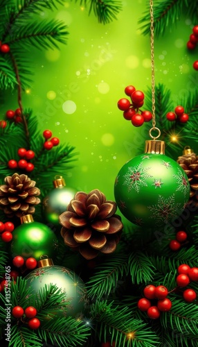 Fototapeta premium Elegant green Christmas wallpaper with shimmering ornaments, pine cones, and berries, christmas background, winter, background